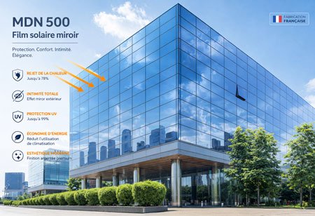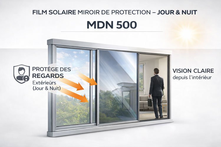 Découvrez le film solaire miroir de protection MDN 500 – Jour & Nuit, une solution haut de gamme fabriquée en France, spécialement conçue pour améliorer le confort, protéger contre le soleil et garantir votre intimité.