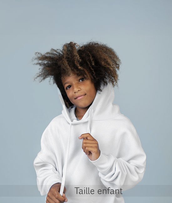 Le sweat à capuche blanc est disponible pour les enfants en tailles : 2 ans – 4 ans – 6 ans – 8 ans – 10 ans – 12 ans, afin de convenir à toutes les morphologies de jeunes enfants et pré-adolescents.