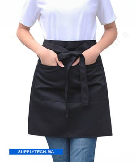 Le prix initial était : د.م. 70,00.د.م. 50,00Le prix actuel est : د.م. 50,00.Tablier de Cuisine noir court unisexe Professionnel – avec Poches